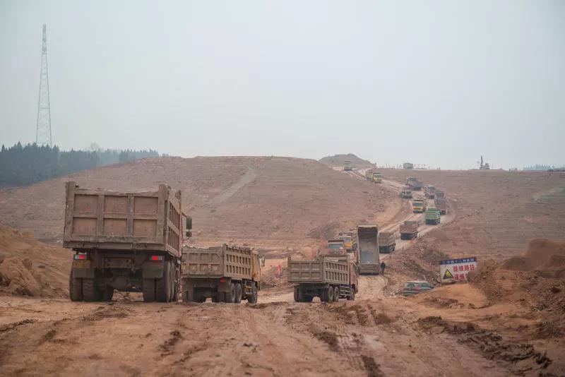 工程自卸車(chē)在機(jī)場(chǎng)建設(shè)便道上川流不息,從這兒能一窺填方高度